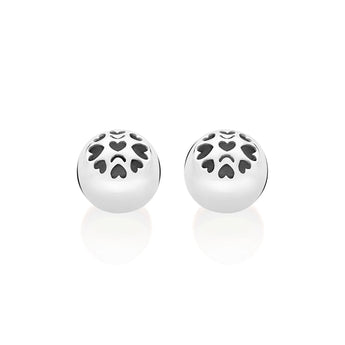 Silver 925 ball stud earrings with hollow heart cutouts. size: 10mm in diameter.