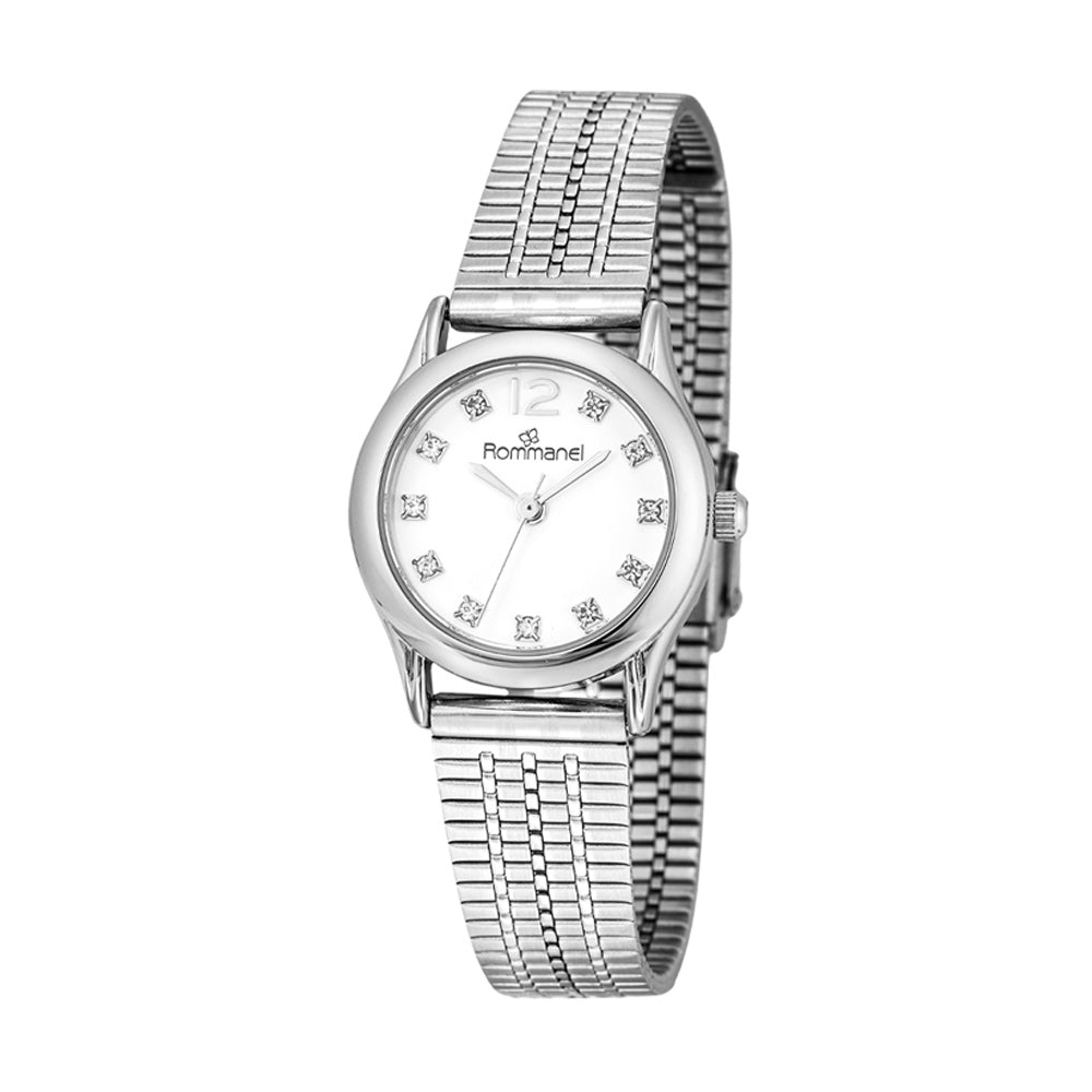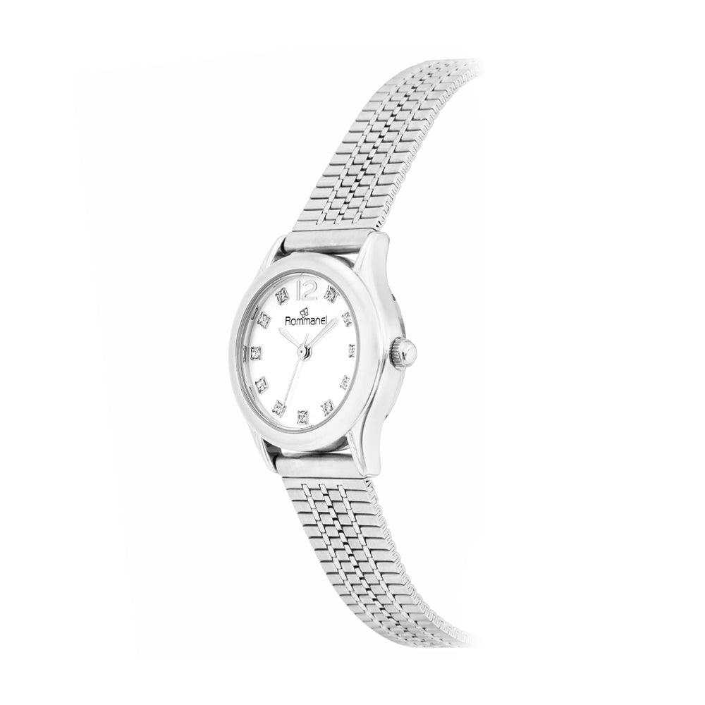 SILVER-TONE ANALOG DRESS WATCH WITH A ROUND METAL CASE, WHITE DIAL ACCENTED WITH 11 CRYSTALS, GRAY NUMBER AND HANDS, MINERAL GLASS, 23 CM STEEL STRAP WITH SLIDING CLASP AND PRESSURE LOCK. WATER RESISTANT UP TO 50 METERS.