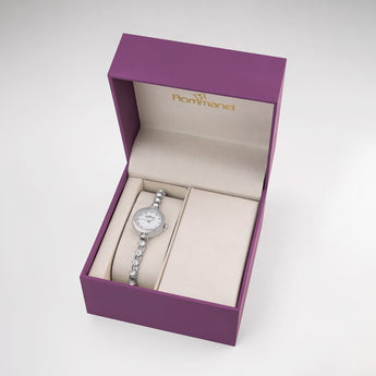 REFINED SILVER-TONE ANALOG WATCH FEATURING A ROUND METAL CASE WITH A METALLIC WHITE DIAL, SILVER HANDS, AND 12 CRYSTALS ON THE FACE. THE MINERAL GLASS PROTECTS THE DIAL, AND THE 20 CM METAL STRAP IS ADORNED WITH 14 CRYSTALS AND SECURED WITH A SNAP CLASP. WATER RESISTANT UP TO 30 METERS.