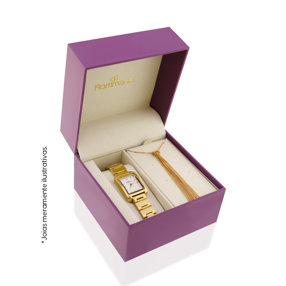 A sophisticated gold-tone analog watch featuring a rectangular metal case with a clean white dial, gold numbers and hands, and a mineral glass crystal. Completed with a stainless-steel bracelet and a secure pressure-lock clasp. Water resistant up to 30 meters (98ft). Measurements: total length 26cm (10.24in).