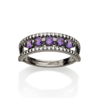 Rommanel's 2020 collection, colors of life, shows us that every color takes us to a special moment, memory, feeling, or experience in our life. by putting all those colors together, we have an amazing understanding and experience of life. in our collection's subcategoy, elegant night, you will find stunnign jewelry for those special moments where you need a touch of elegance. black rhodium triple ring studded with forty-six (46) white cubic zirconia measuring 1mm each and five (5) purple cubic zirconias measuring 3mm at the center. | material: black rhodium plated.â | also available in gold plated. (licensed jewelry collection 2020 - 1st cycle)"