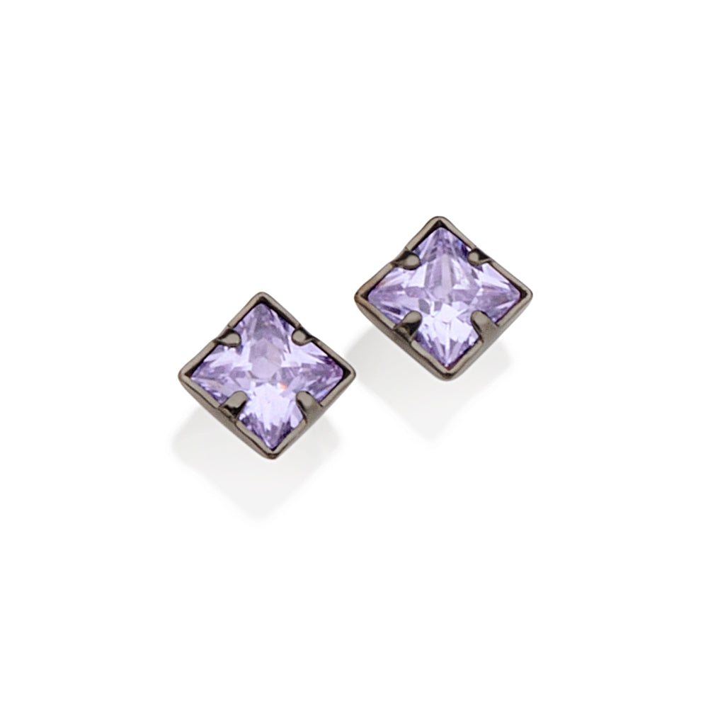 Rommanels celebrate collection was inspired by gratitude a feeling that always surrounds us during celebrations. this collection features delicate and timeless pieces that showcase our stunning colored zirconias. in this collection we bring you colored pieces that have a meaning for each aspect of your life – with the color purple representing transformation. black rhodium stud earring composed of one (1) purple square crystal measuring 6x6mm. entire earring measures 0.7 x 0.7cm. add a touch of color to you look while attracting positive vibes during this holiday season. | size: 0.7cm x 0.7cm.â | material: black rhodium plated.