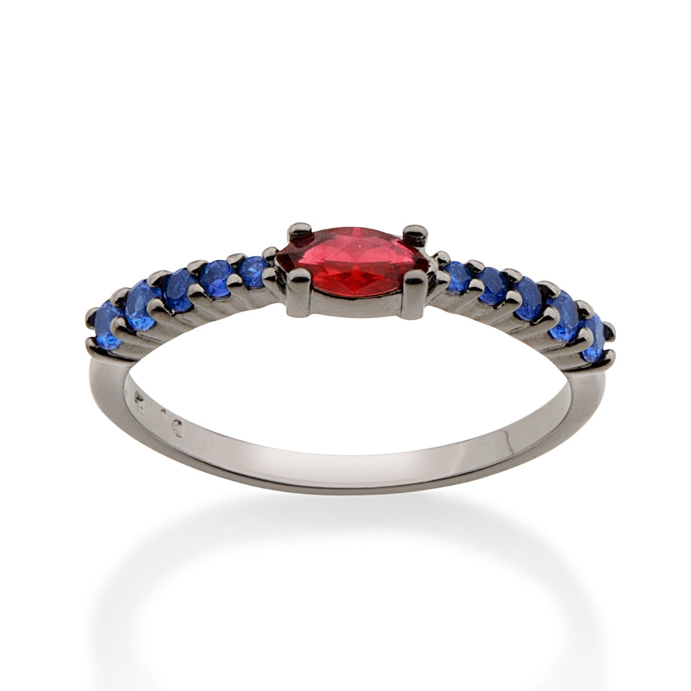 Rommanelss joy for life by ana hickmann collection was inspired by the happy moments in ana hickmann’s life. these pieces were inspired by family and our teddy bear line showcases the delicacy and care of a mothers touch. black rhodium skinny ring composed of four (4) blue zirconias measuring 2mm each, two (2) blue zirconias measuring 1.75mm each, two (2) blue zirconias measuring 1.5mm each, two (2) blue zirconias measuring 1.25mm each and one (1) red navette zirconia measuring 3x6mm at the center. get creative with color by adding this ring to your jewelry collection. also available in gold plated. (licensed jewelry collection ana hickmann 20th edition)"