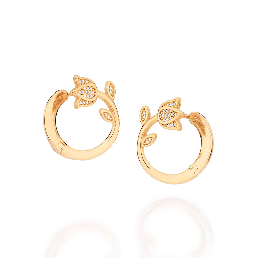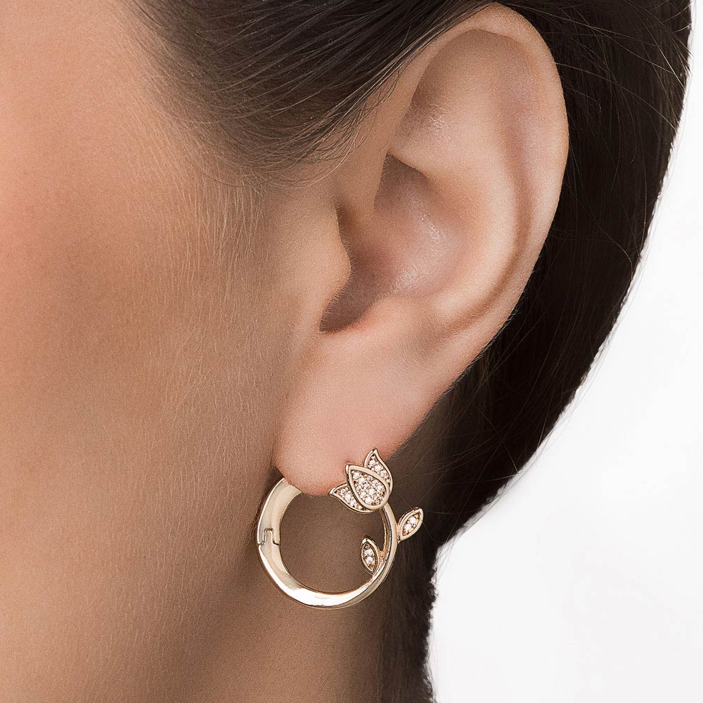 Designed with a sculptural frame and adorned with a tulip flower set with 42 zirconias of 0.80 mm, these 18k gold-plated earrings offer a light yet detailed floral presence. measures approx. 1.9 × 2.1 cm (0.75 × 0.83 in). (licensed ana hickmann collection)