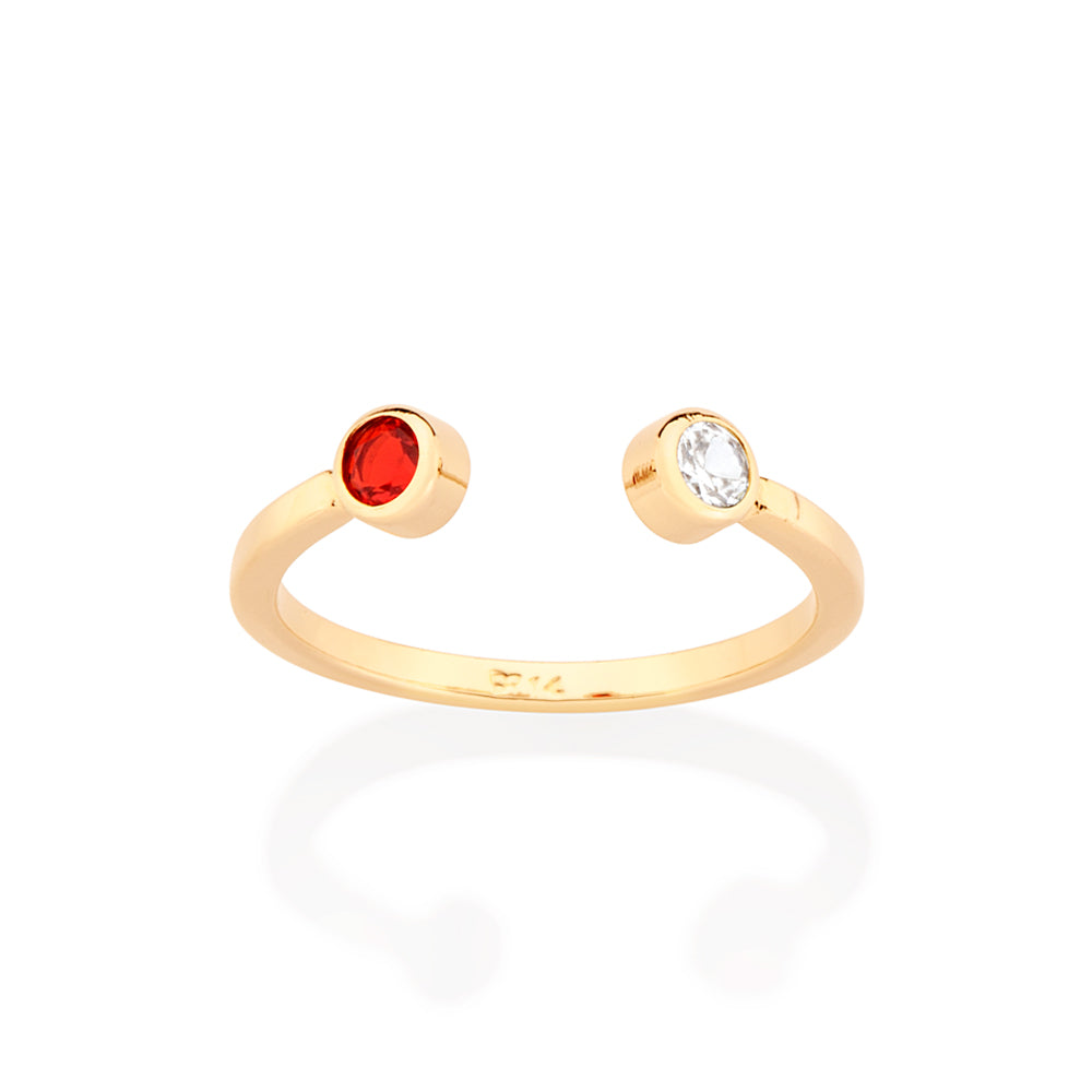 Gold plated adjustable ring composed of two zirconias in red and white measuring 3mm each.
