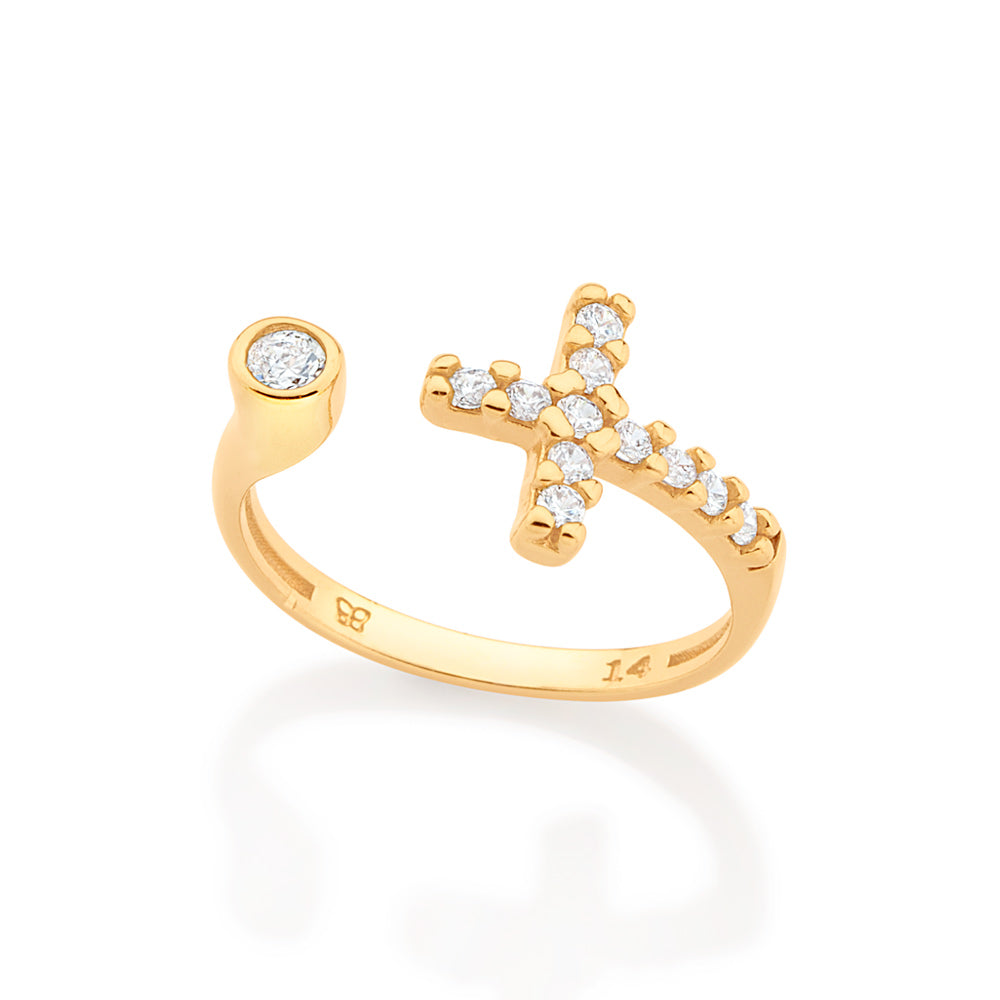 Gold plated adjustable ring in the shape of a cross studded with 11 white zirconias measuring 1.5mm each and 1 white zirconia measuring 2.5mm. exclusive licensed jewelry of ""giovanna antonelli fashion jewelry"" collection "
