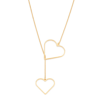 Gold plated y-necklace composed of a cable link chain with a large hollow heart at each end. size: 72cm (28.3in) - can be adjusted.