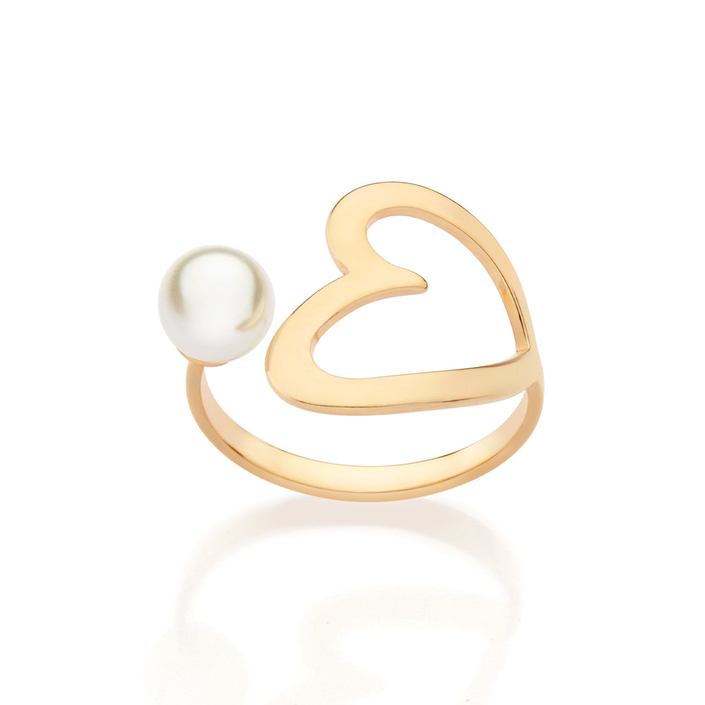 18k gold plated-plated adjustable ring in the shape of a hollow heart with one (1) synthetic pearl measuring 6mm.