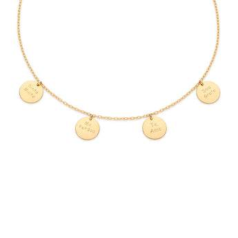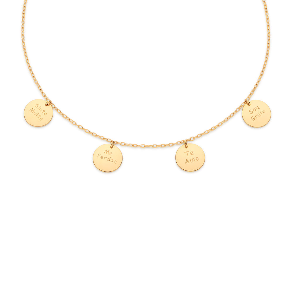 Gold plated, necklace composed of a cable link chain and 4 circle pendant with the words sinto muito (i’m sorry), me perdoa (forgive me), te amo (i love you), and sou grata (i’m thankful) engraved into it. size: 45cm - can be adjusted to 42cm (17.7in - can be adjusted to 16.5in). "