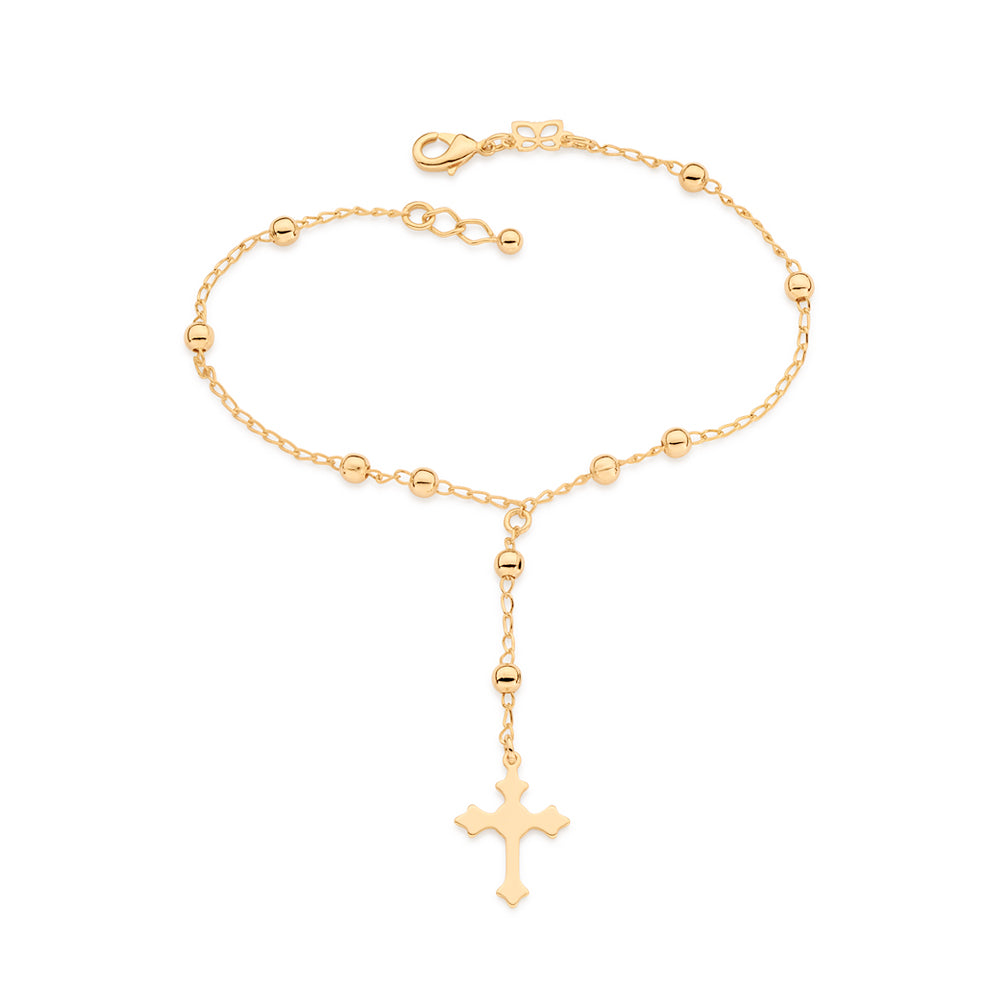 Gold plated bracelet in the style of a rosary composed of a cable link chain studded with spheres measuring 3.5mm each with a cross pendant. size: 20cm - can be adjusted to 19cm .