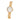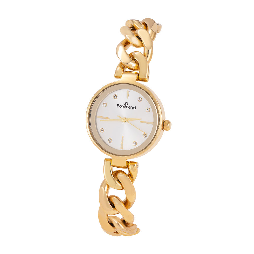 Gold social analog watch, round metal case, metallic white dial, gold hands with 8 crystals, mineral glass, gold metal bracelet with pressure clasp, water-resistant up to 50m. watch dimensions: 21 cm case dimensions: 30mm x 30mm x 9mm "
