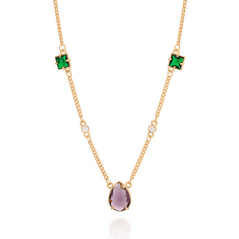 The miss violet collection was inspired by the color of the year and by violets a lovely, and delicate flower. Rommanel has brought the essence of these flowers to the collection and created jewelry that is full of meaning. let yourself be carried away by the delicacy of these flowers too. gold plated necklace composed of a 0.5mm curb chain measuring 50cm - can be adjusted to 45cm - featuring two (2) green crystals measuring 6x6mm each, two (2) white zirconieas measuring 3mm each, and one (1) purple crystal in the shape of a water drop measuring 10x14mm. an absolute must have in your collection! | size: 50cm - can be adjusted to 45cm. | material: 18k gold plated. "