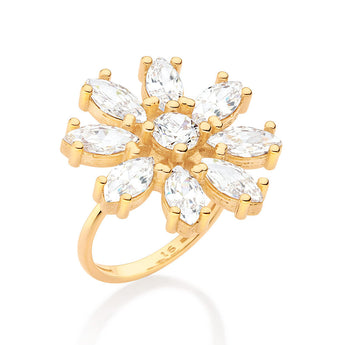 Gold plated maxi ring in the shape of a flower studded by 8 white zirconias measuring 4x8mm each and 1 white zirconia measuring 5mm at the center.