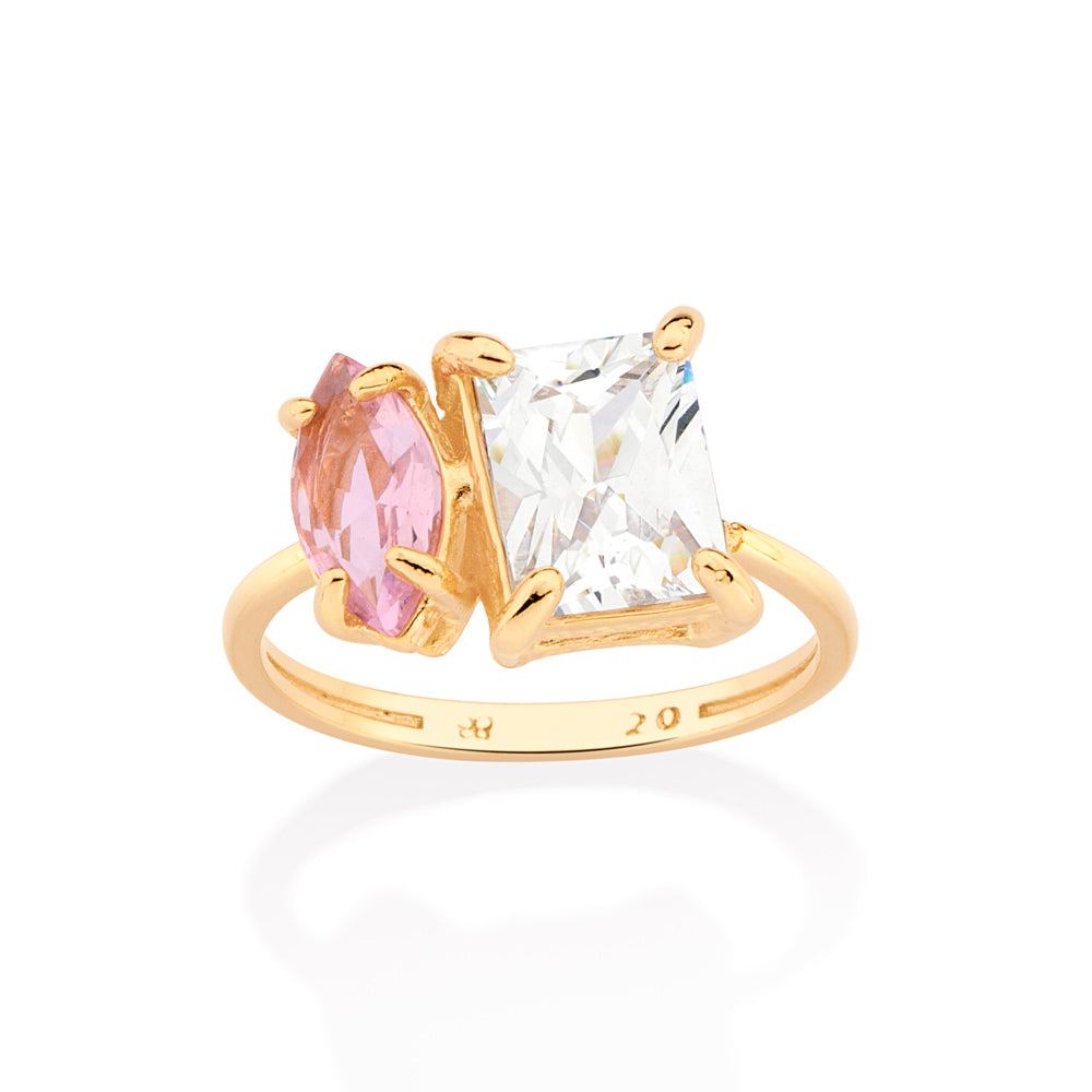 Gold plated engagement ring studded by 1 pink baguette zirconia measuring 7x9mm and 1 white rectangular zirconia measuring 5x10mm.