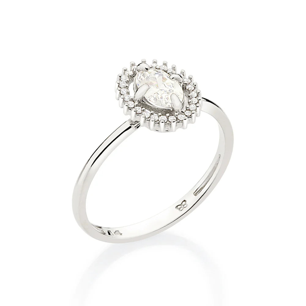 Platinum solitaire ring studded with 24 white zirconias measuring 8mm each and 1 white oval zirconia measuring 4x6mm at the center.