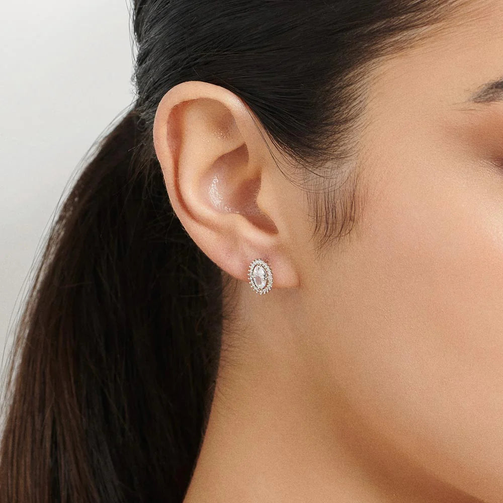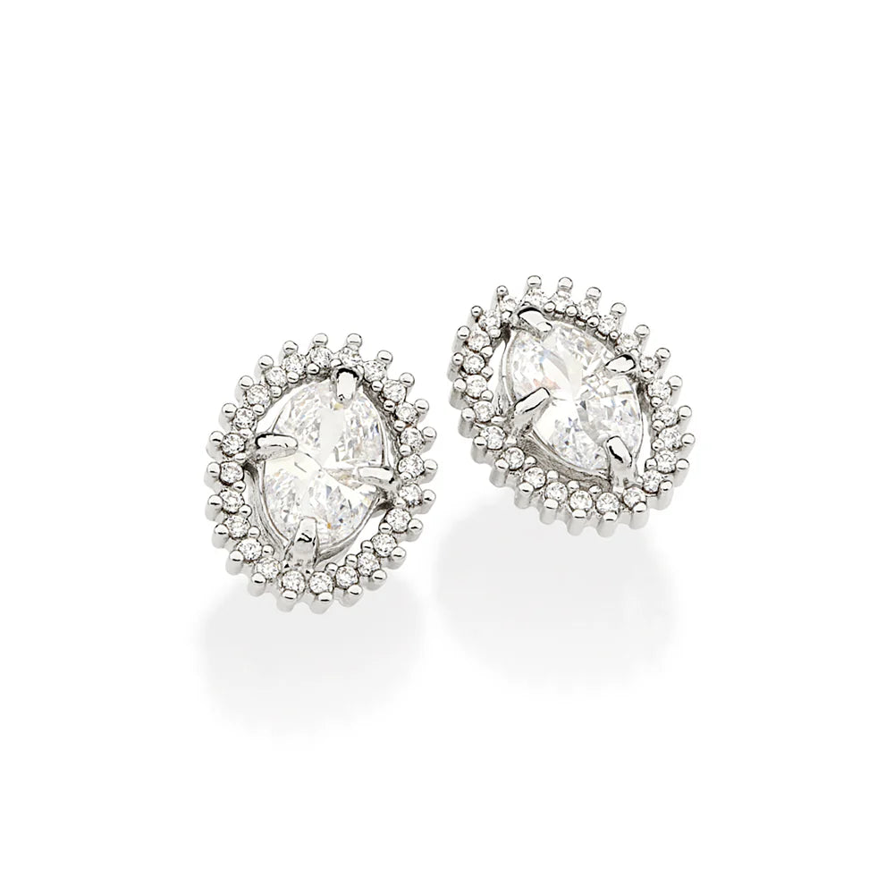 Platinum stud earring studded with 24 white zirconias measuring 8mm each and 1 white oval zirconia measuring 4x6mm at the center. size: 1cm x 0.8cm (0.4in x 0.3in).
