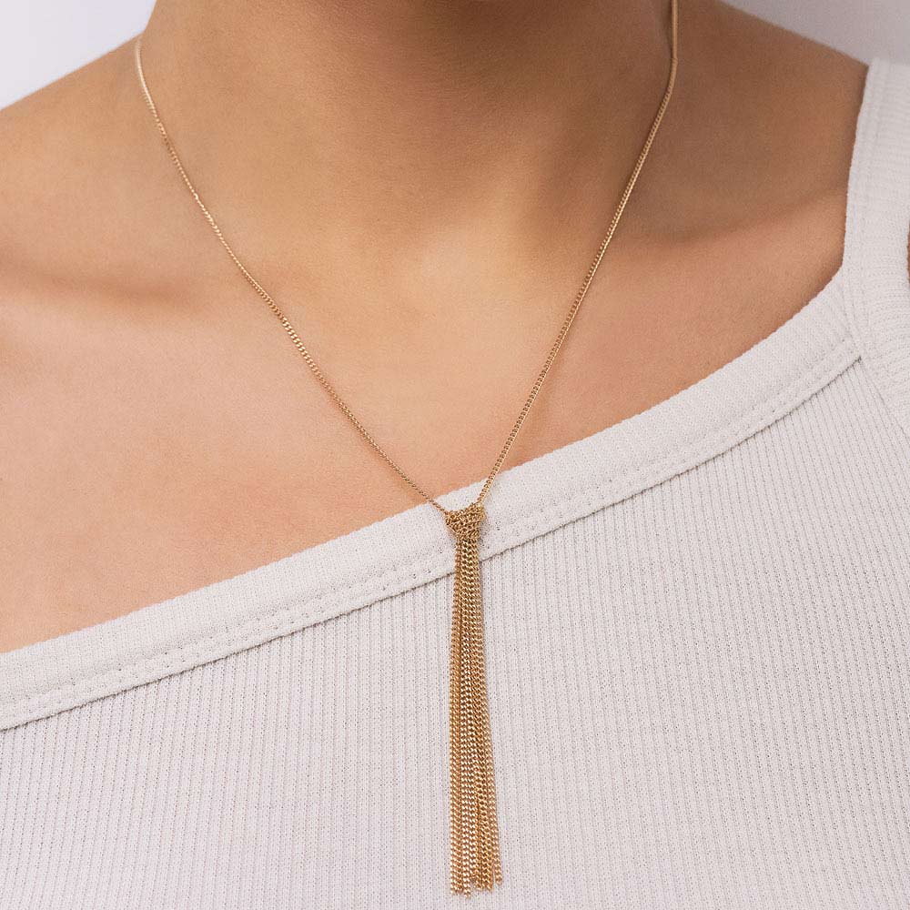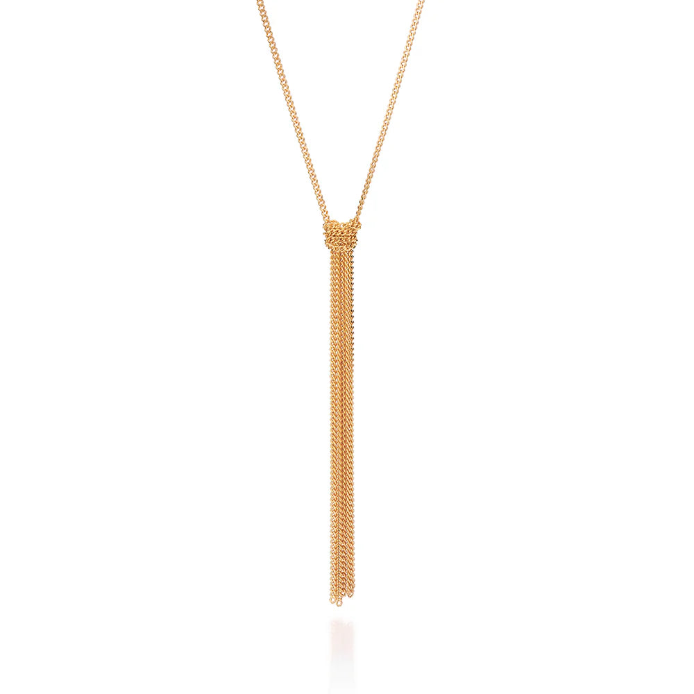 Add a touch of sophistication and movement to your look with the knot of elegance necklace. crafted in 18k gold plating, this beautiful piece features a cuban link chain with a stunning knot detail at the center, from which 8 cascading chains create a chic fringe effect. the necklace.