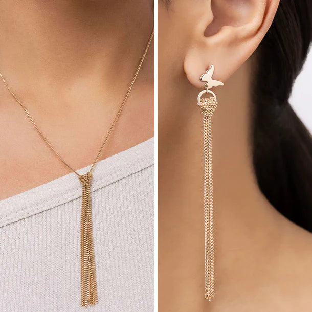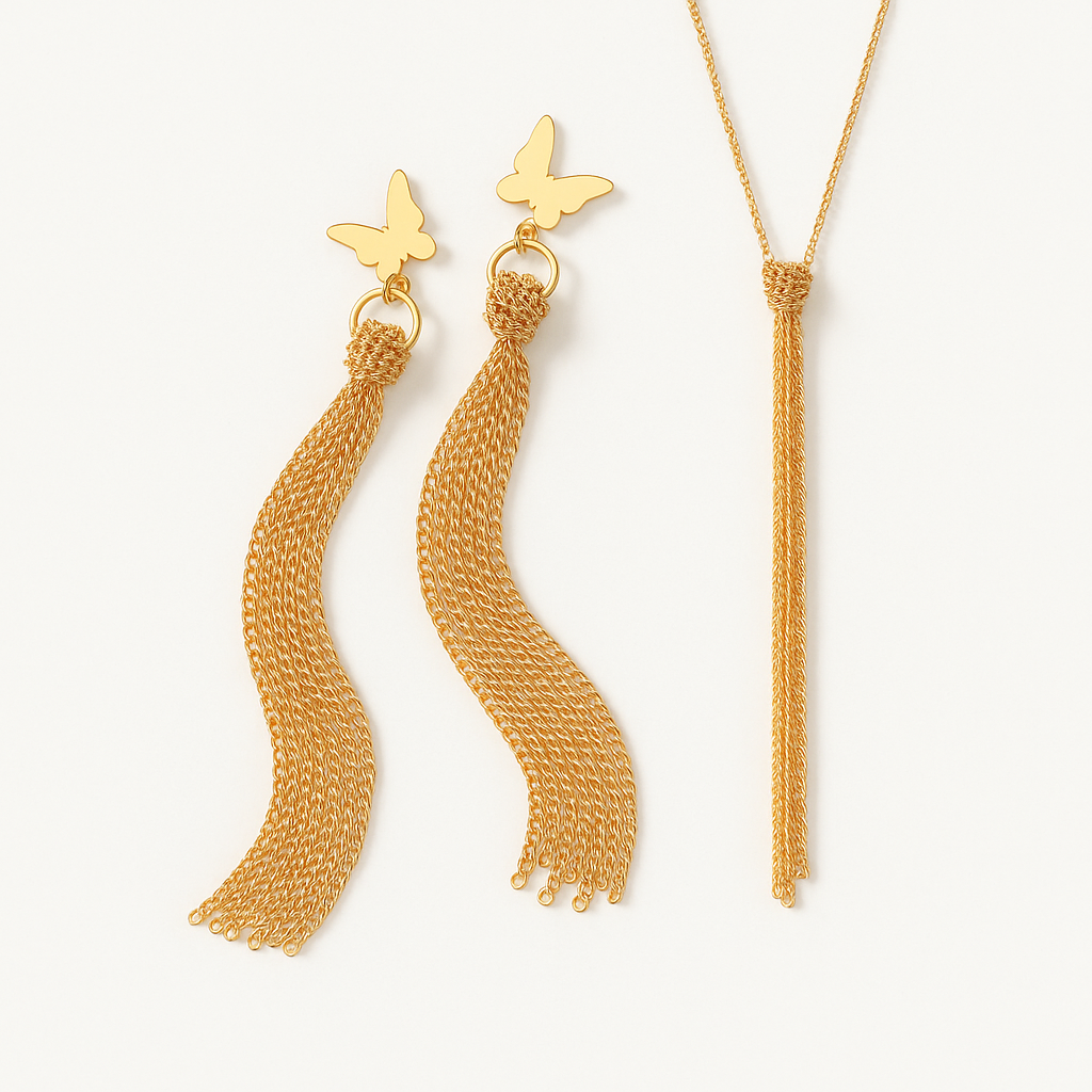 Unleash your inner beauty with the wings of elegance earrings. crafted in 18k gold plating, these stunning earrings feature a delicate butterfly design with 16 cascading chains that form a dramatic fringe, adding fluid movement and a touch of glamour to any look. measuring 8.9 cm x 1