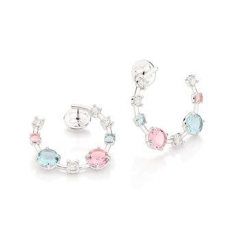Rommanel is proud to present another collection, breaking dawn, with brazilian celebrity, Ana hickmann. this collection was inspired by the new beginnings that everyday brings us. platinum hoop earrings studded with six (6) zirconias measuring 3.5mm each, two (2) zirconias measuring 4mm each, four (4) crystals measuring 4mm each, and four (4) crystals measuring 8mm each. crystals and zirconias are in white, light pink, and light blue. | size: 3.2cm in diameter (1.26in in diameter). | stone: zirconia and crystal. | material: platinum plated. (licensed jewelry collection - breaking dawn by Ana hickmann)"