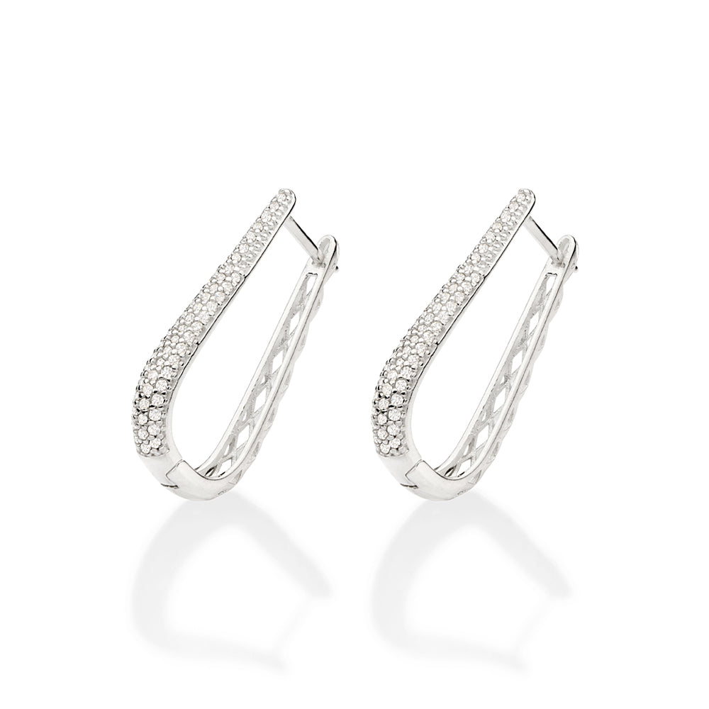 Silver 925 oval hoop earrings studded by one hundred and six (106) white zirconias measuring 1mm each. size: 2.7cm x 0.4cm (1.06in x 0.16in).